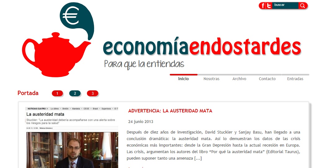 Gracias al programa sobre webs del canal 24 horas he descubierto un blog que tiene muy buena pinta, se llama «economía en dos tardes» y, según palabras de sus propias creadoras, Rebeca Gimeno y Marta Soria «son dos economistas-periodistas que tratan de explicar la economía a todo el mundo».