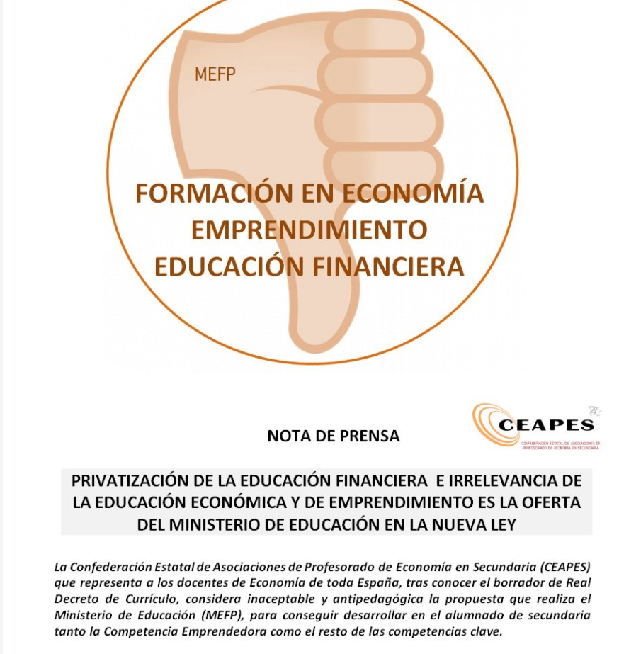 El profesorado de Economía en secundaria pide al Ministerio de Educación una última reflexión antes de la aprobación del Real Decreto que regula la nueva ley educativa. Tras analizar el borrador del Real Decreto se constata que de poco han servido las enmiendas que CEAPES hizo a la actual Ley de Educación (LOMLOE) ni las reuniones que mantenidas con los distintos grupos parlamentarios ni las recomendaciones tanto de Instituciones Nacionales como Internacionales (OCDE, Informe PISA, Conferencia de Decanos de Economía y Empresa, los Colegios de Economistas y otras). Es más, incluso el propio Ministerio de Educación (MEFP) menciona la importancia de la Formación Económica.