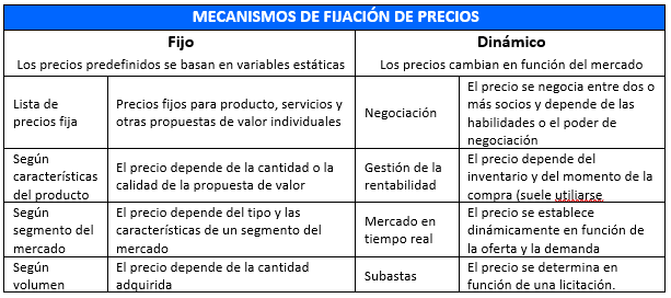 Cada fuente de ingresos puede tener un mecanismo de fijación de precios diferente, lo que puede determinar cuantitativamente los ingresos generados. Existen dos mecanismo de fijación de precio principales: fijo y dinámico.