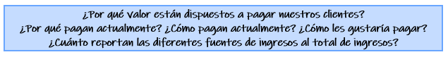 Si los clientes constituyen el centro de un modelo de negocio, las fuentes de ingresos son sus arterias. Las empresas deben preguntarse lo siguiente: ¿por qué valor está dispuesto a pagar cada segmento del mercado? Si responde correctamente a eta pregunta, la empresa podrá crear una o varias fuentes de ingresos en cada segmento de mercado. Cada fuente de ingresos puede tener un mecanismo de fijación de precios diferente: lista de precio fijos, negociaciones, subastas, según mercado, según volumen o gestión de la rentabilidad.