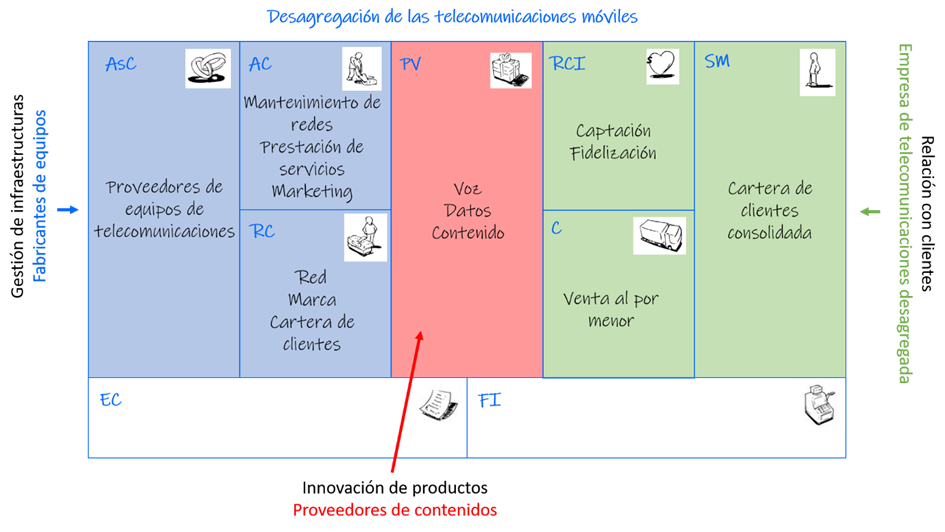Las empresas de telecomunicaciones móviles han empezado a desagregar sus actividades. Antes la competencia se basaba en la calidad de la red, pero ahora las empresas prefieren compartir la red con sus competidores o externalizar las operaciones de red a los fabricantes de equipos. ¿Por qué? Porque se han dado cuenta de que su activo clave ya no es la red, sino la marca y las relaciones con los clientes.