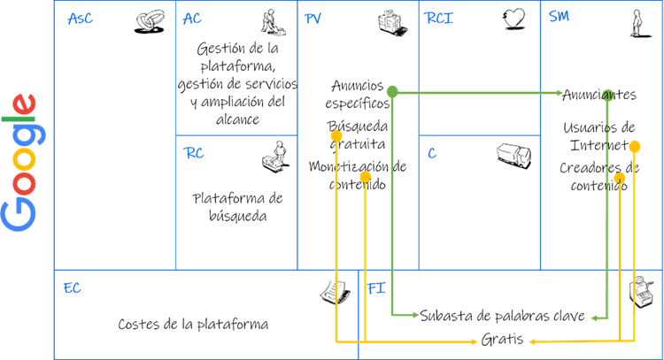 Otros ejemplos son Google o Apple. La clave del modelo de negocio de Google es su propuesta de valor: proporcionar anuncios de texto muy específicos en toda la web. Su servicio AdWords permite a los anunciantes publicar anuncios y enlaces patrocinados en las páginas de búsqueda de Google. Estos anuncios se muestran junto a los resultados de la búsqueda cuando los usuarios utilizan el motor de búsqueda de Google. Google garantiza que sólo se muestran anuncios relacionados con el término de la búsqueda.