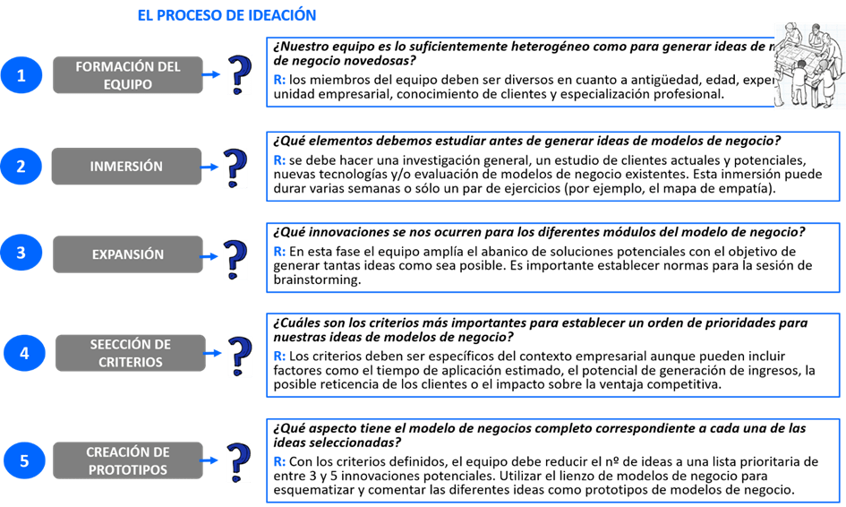 Consiste en desafiar las normas para diseñar modelos de negocio originales que satisfagan necesidades desatendidas, nueva u ocultas de los clientes. Para encontrar opciones nuevas o mejores, es necesario engendrar un puñado de ideas para después elegir las más apropiadas. De esto se deduce que la ideación tiene dos fases: la generación de ideas, donde lo importante es la cantidad, y la síntesis, en la que las ideas se comentan y combinan para finalmente escoger un número reducido de opciones viables.