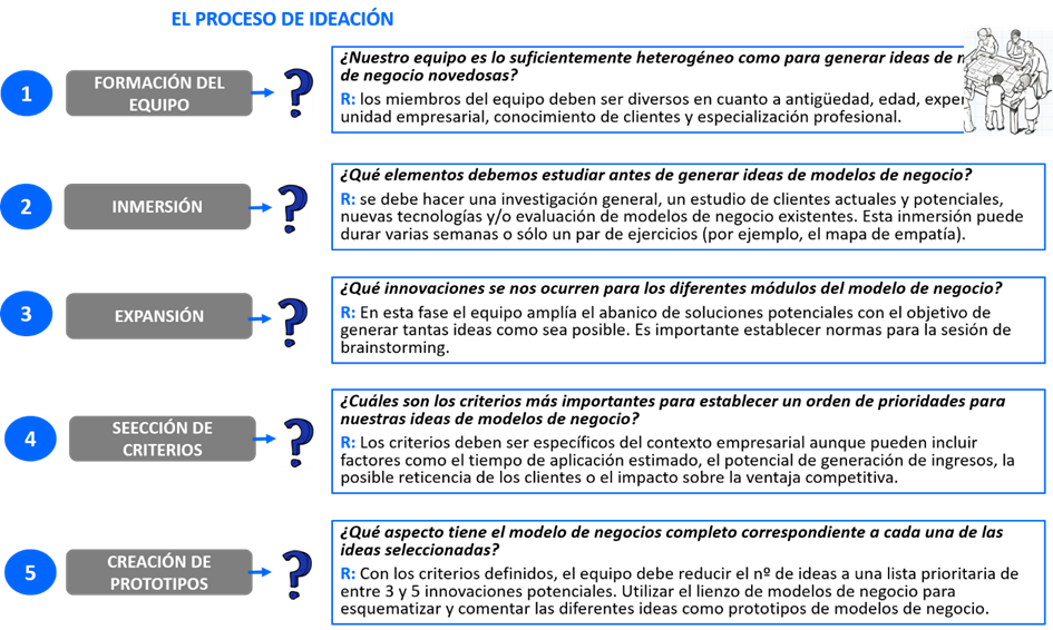 Consiste en desafiar las normas para diseñar modelos de negocio originales que satisfagan necesidades desatendidas, nueva u ocultas de los clientes. Para encontrar opciones nuevas o mejores, es necesario engendrar un puñado de ideas para después elegir las más apropiadas. De esto se deduce que la ideación tiene dos fases: la generación de ideas, donde lo importante es la cantidad, y la síntesis, en la que las ideas se comentan y combinan para finalmente escoger un número reducido de opciones viables.