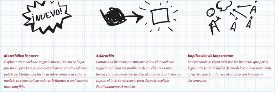 Al igual que el lienzo del modelo de negocio ayuda a esbozar y analizar los modelos nuevos, la narración de historias ayudará a explicar eficazmente en qué consiste el modelo. Las buenas historias enganchan al público y por esa razón una historia es la herramienta ideal para preparar un debate en profundidad sobre un modelo de negocio y la lógica subyacente. La narración de historias aprovecha el poder explicativo del lienzo de modelo de negocio, ya que acaba con la incredulidad ante lo desconocido.