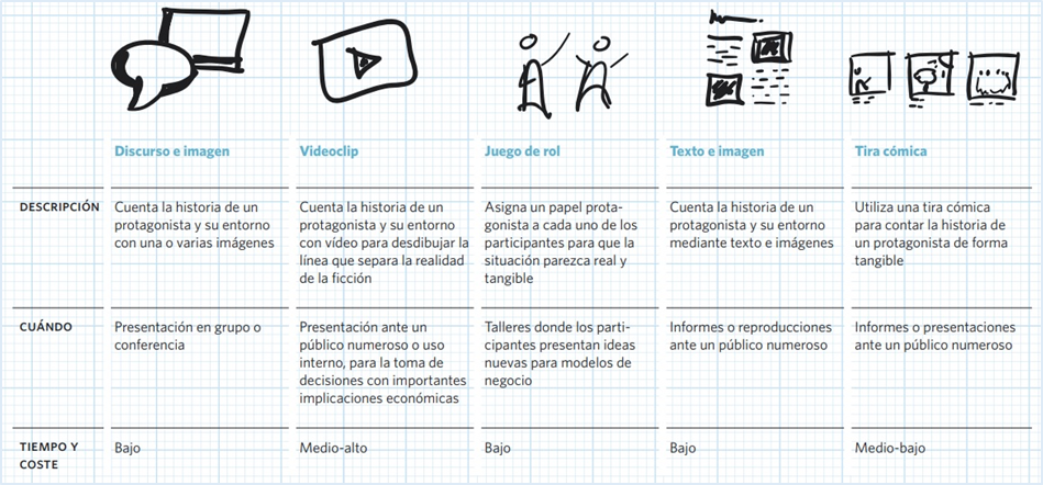 Describen diversos aspectos relacionados con el cliente: cómo se utilizan los productos o servicios, qué tipos de clientes los utilizan o cuáles son las preocupaciones, los deseos y los objetivos de los clientes. Estos escenarios se basan en aportaciones de clientes, pero van un paso más allá al incorporar información sobre los clientes en una serie de imágenes concretas y definidas. Al describir una situación específica, el escenario hace tangible la aportación del cliente.