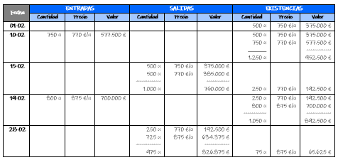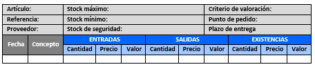 Ejemplo: rellena una ficha de almacén según los criterios PMP y FIFO para determinar el valor total de las existencias de una empresa que ha registrado las siguientes operaciones en su almacén: