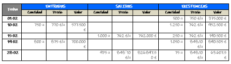 Se compran 750 unidades, lo que supone una entrada de esas unidades en el almacén que hay que registrar en la columna correspondiente “entradas”. El problema es que ahora tenemos unidades a dos precios distintos, la solución es calcular el precio medio ponderado de las mismas: