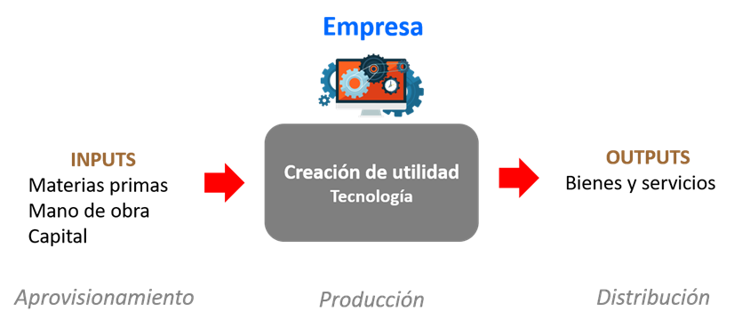 Como vimos en Economía de 1º, las familias satisfacen sus necesidades mediante el consumo de bienes y servicios pero, para que esto pueda suceder, primero estos bienes y servicios han de ser producidos. Las empresas son el agente económico encargado de producir bienes y servicios, transforman los factores productivos (inputs) en productos (output), generando valor o utilidad en el proceso.