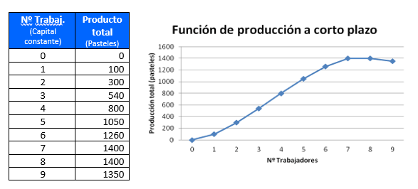 Para analizar la producción a corto plazo vamos a utilizar un ejemplo. Supongamos que un grupo de amigos decide montar una pastelería. Los factores productivos necesarios para la producción de pasteles son el trabajo (número de trabajadores a contratar), el capital (un local, hornos, utensilios para hacer pasteles, mobiliario y materias primas) y la iniciativa empresarial necesaria para llevar adelante el proyecto.