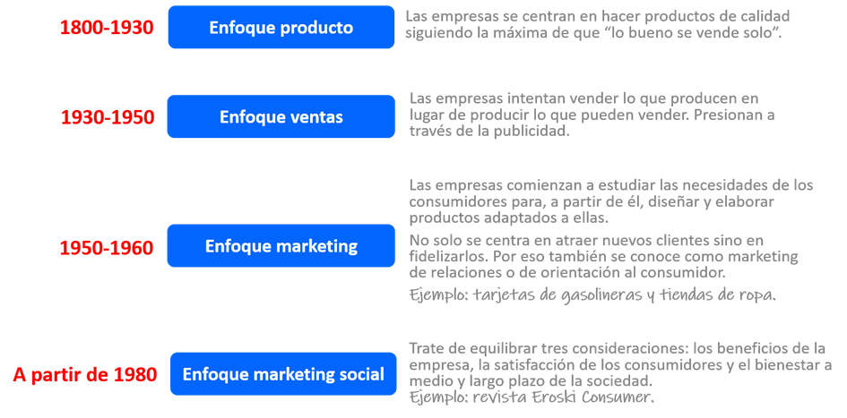Como resultado de esta evolución de la función comercial, las empresas han ido reorientando su estrategia a partir de cuatro enfoques: producto, ventas, marketing y marketing social.
