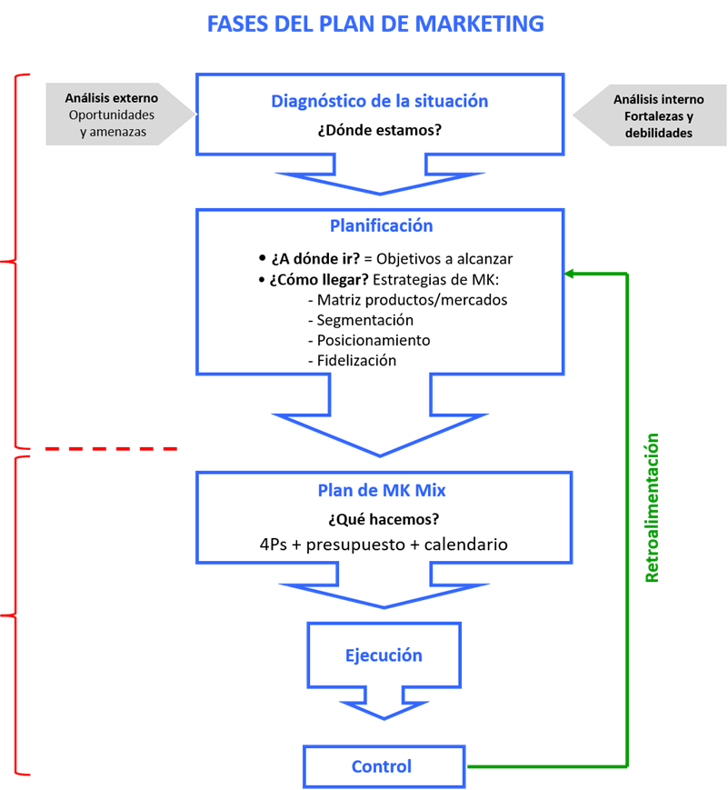 Las actividades de marketing de una empresa pueden agruparse en dos grandes fases: por un lado, una fase de análisis o marketing estratégico, cuyo objetivo es el estudio de las necesidades del mercado y de su evolución; por otro, una fase de acción denominada marketing operativo, cuya misión específica es la satisfacción de esas necesidades a través del desarrollo de los productos adecuados.