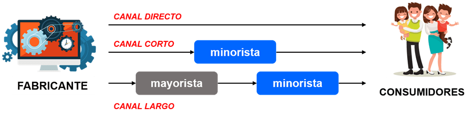 - Canal largo. Está formado por dos etapas o más, y en él intervienen como mínimo un mayorista y un minorista que conectan al fabricante con el consumidor. Son canales típicos de los productos de consumo masivo o de compra frecuente (alimentos, productos de limpieza), que requieren la presencia del producto en el mayor número posible de puntos de venta o en productos comercializados en espacios geográficos grandes.