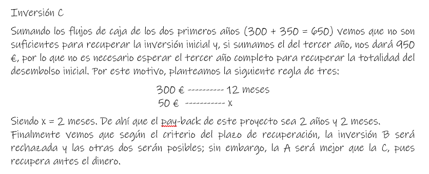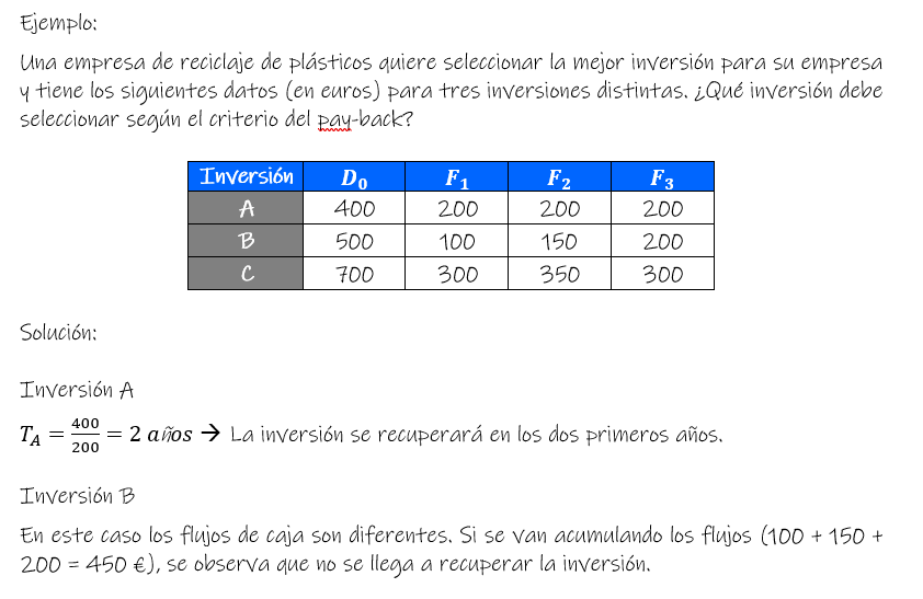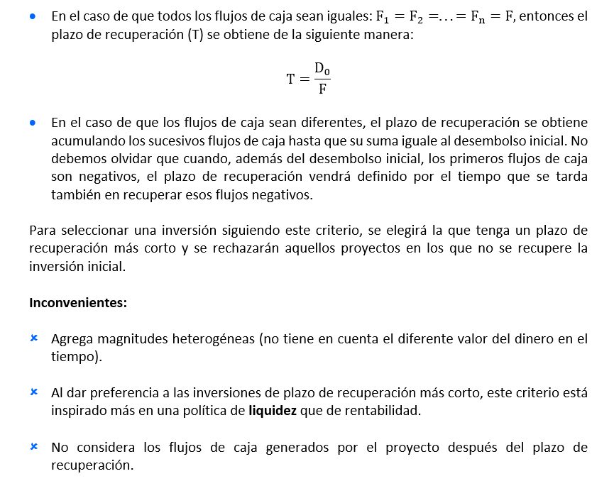 Aunque hay varios métodos de este tipo nosotros sólo vamos a estudiar el pay-back o plazo de recuperación (T). Consiste en determinar el número de años que se tarda en recuperar el desembolso inicial.