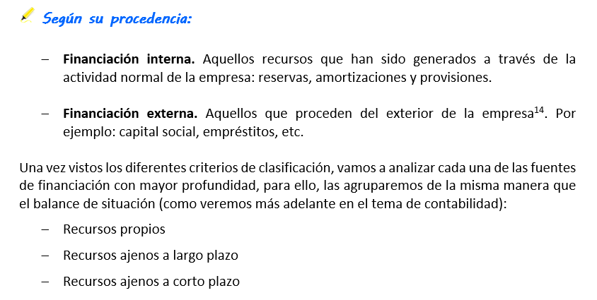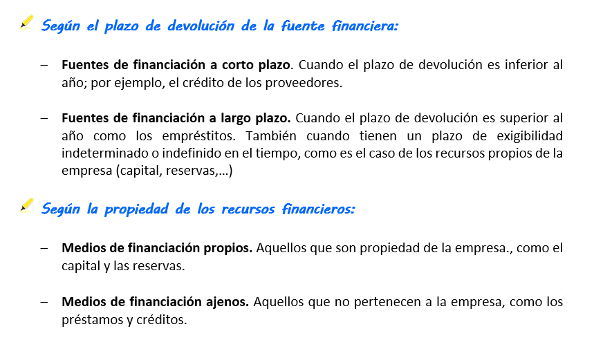 Las fuentes de financiación son los recursos líquidos o medios de pago a disposición de la empresa para hacer frente a sus necesidades dinerarias.