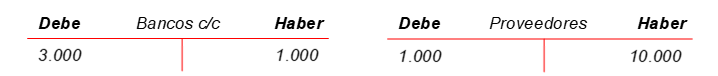 Saldo de la cuenta Bancos c/c = 3.000 – 1.000 = 2.000 de saldo deudor, es decir, el banco nos debe 2.000 €.