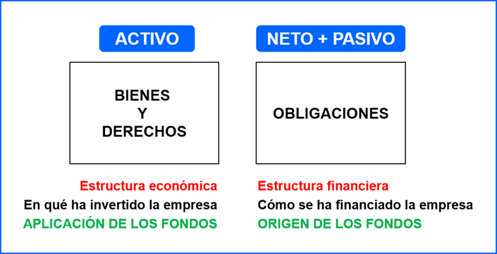 El activo constituye la estructura económica, el lugar en el que se han invertido los fondos de la empresa. El pasivo y el neto reflejan la estructura financiera, el origen de los fondos con los que se ha financiado el activo. El balance muestra el equilibrio entre estas dos estructuras: