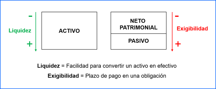 El criterio más utilizado es el que clasifica los elementos del activo según su disponibilidad o liquidez (capacidad para convertirse en dinero) y los elementos de pasivo según su exigibilidad (las deudas más exigibles son aquellas que vencen antes).