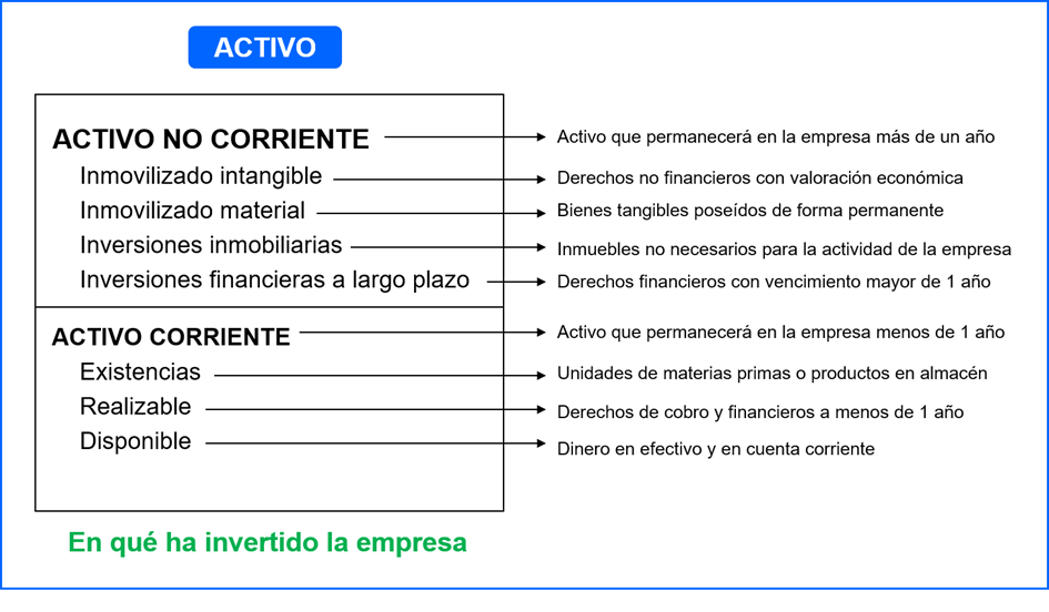 El conjunto de bienes y derechos de la empresa constituye el activo mientras que las obligaciones constituyen el pasivo. La diferencia entre el activo y el pasivo se denomina patrimonio neto, neto patrimonial o recursos propios.