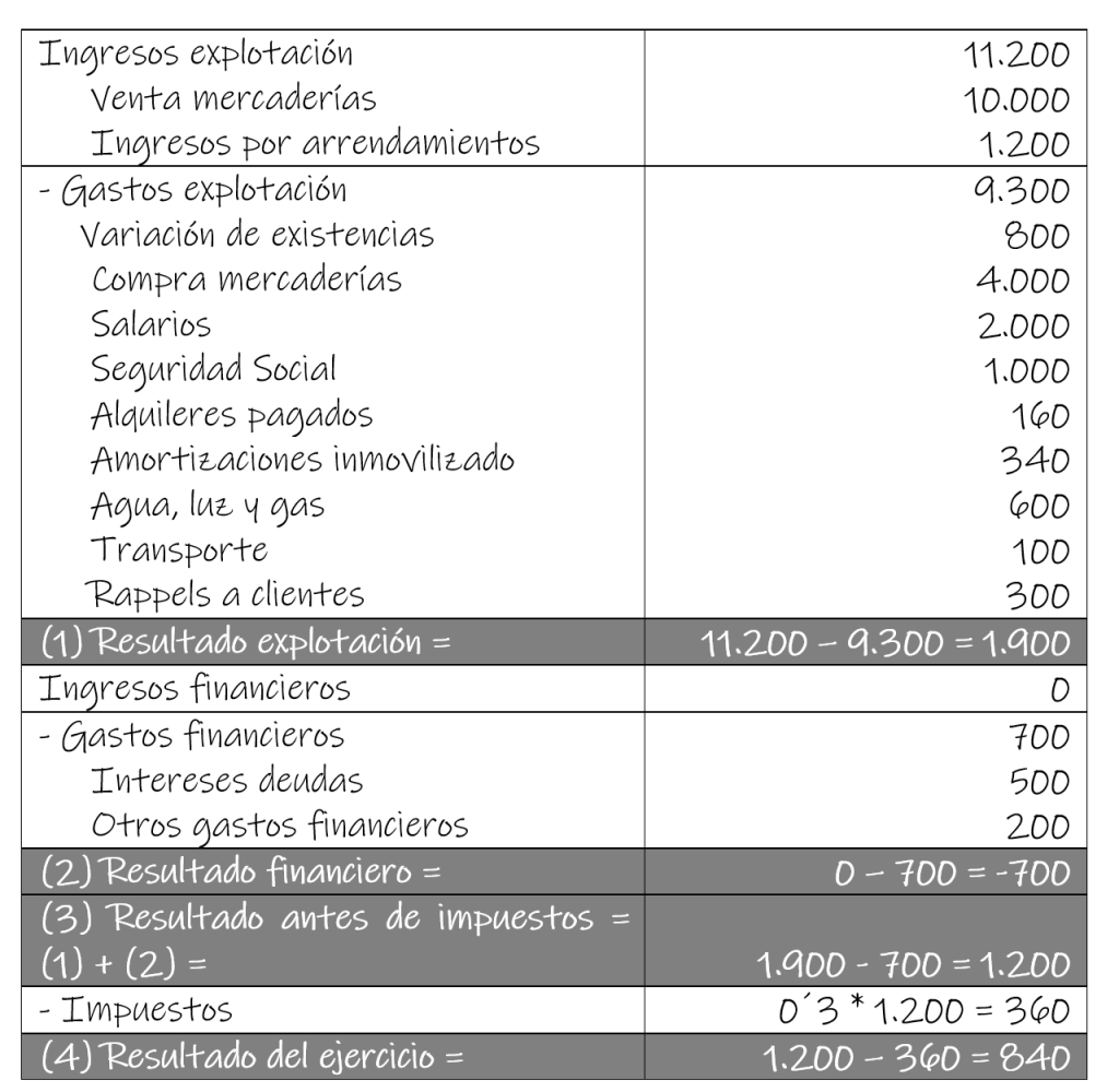 Ejemplo. Una empresa presenta la siguiente información en miles de euros. Confecciona la cuenta de pérdidas y ganancias y determina el resultado del ejercicio. Venta de mercaderías, 10.000; saldo inicial de existencias de mercaderías, 2.000; saldo final de existencias de mercaderías, 1.200; compras de mercaderías, 4.000; ingresos por arrendamientos, 1.200; sueldos y salarios, 2.000; Seguridad Social a cargo de la empresa, 1.000; alquileres pagados, 160; amortización del inmovilizado, 340; agua, gas y electricidad, 600; transportes, 100; rappels concedidos a clientes, 300; intereses de deudas, 500; otros gastos financieros, 200.