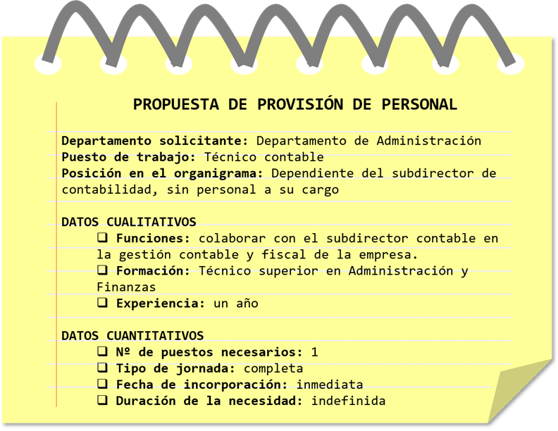 La planificación de los recursos humanos es un proceso mediante el cual la empresa determina el número de empleados necesarios, con el perfil profesional adecuado, en los puestos idóneos, en el momento preciso. Este proceso lo realiza el Departamento de Recursos Humanos junto con los responsables de cada departamento. Estos periódicamente rellenan y envían un formulario denominado propuesta de provisión de personal con la previsión de necesidades de puestos de trabajo de su sección, en el que se recogen todos los datos del puesto a cubrir.