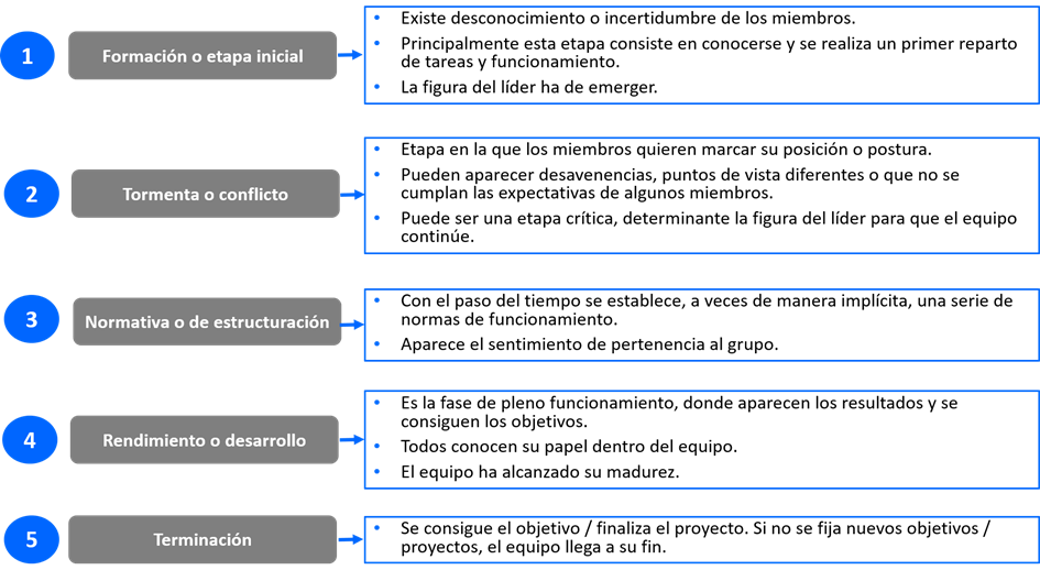 Desde el origen, todos los equipos pasan por una serie de fases o etapas. Tomaremos la teoría de Tuckman para explicar las fases de la formación de equipos, que desarrollamos a continuación.
