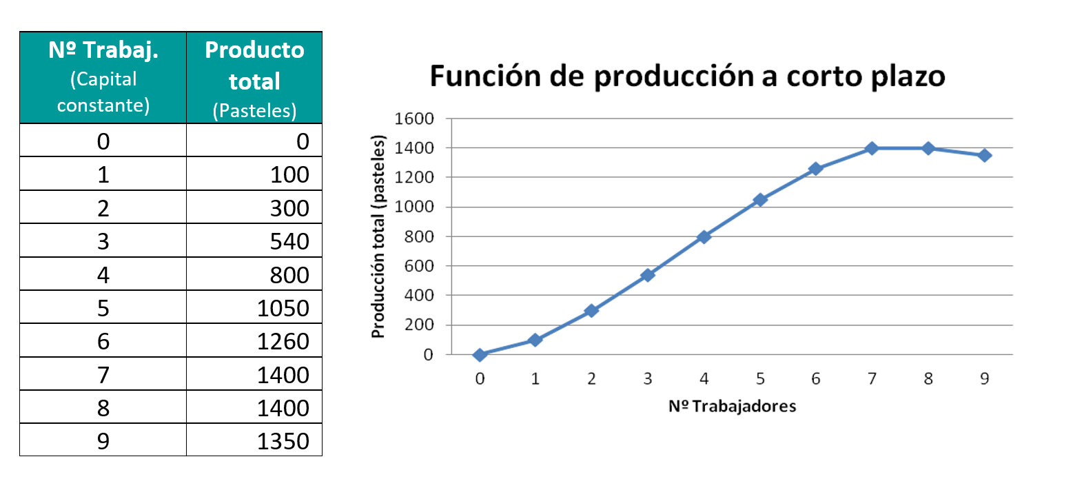 Para analizar la producción a corto plazo vamos a utilizar un ejemplo. Supongamos que un grupo de amigos decide montar una pastelería. Los factores productivos necesarios para la producción de pasteles son el trabajo (número de trabajadores a contratar), el capital (un local, hornos, utensilios para hacer pasteles, mobiliario y materias primas) y la iniciativa empresarial necesaria para llevar adelante el proyecto.