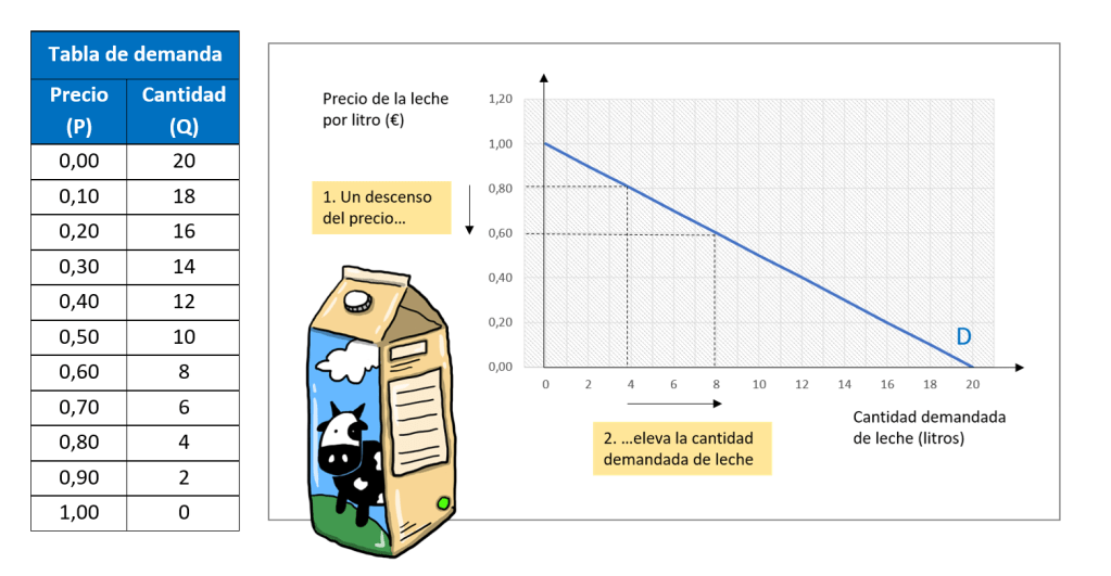 La curva de demanda de un bien es la representación gráfica de la función de demanda, la cual muestra las cantidades de ese bien que los compradores están dispuestos a adquirir a cada precio. Por ejemplo, vamos a representar la demanda de leche.