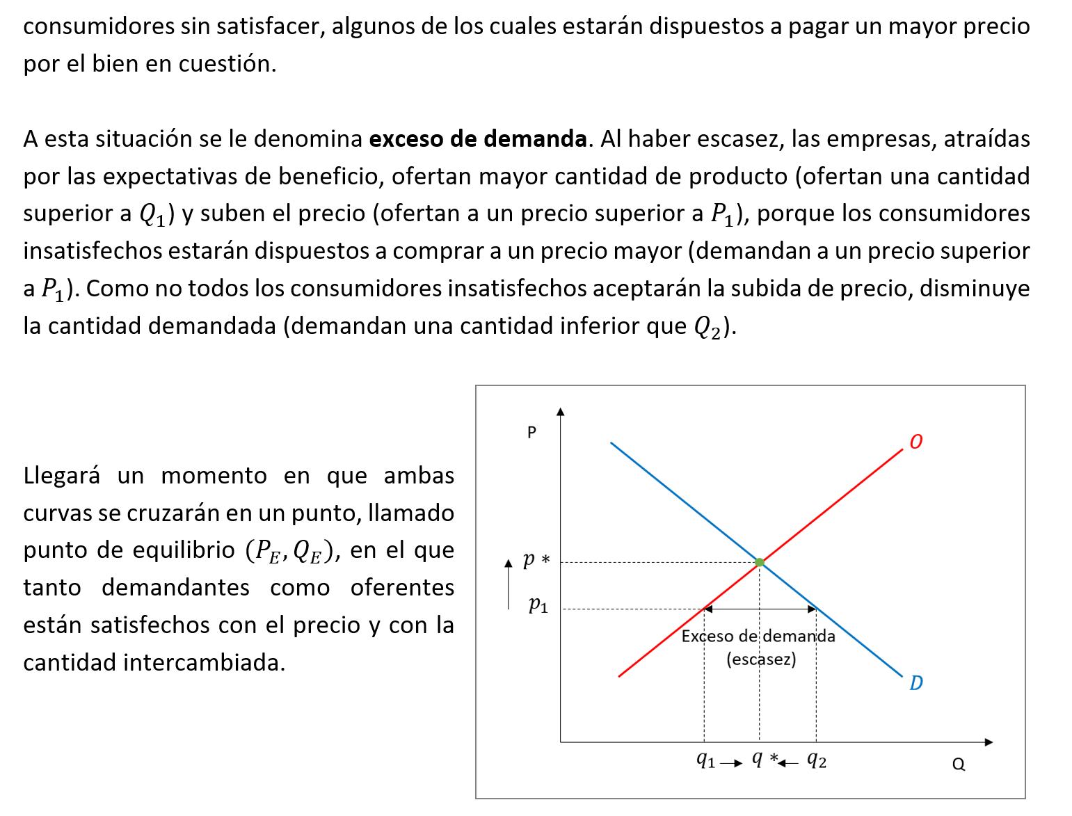 El punto de equilibrio (E): en este punto (p*, q*) los deseos de los oferentes coinciden con los de los demandantes. En él la cantidad que unos están dispuestos a producir a un determinado precio coincide con la que otros están dispuestos a consumir. Aquí decimos que el mercado “se vacía”, porque la cantidad comprada y la vendida son iguales.