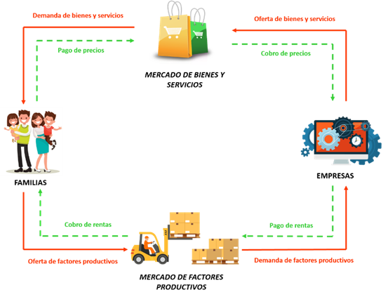 Aunque da igual por donde empecemos a explicarlo, lo haremos partiendo de las familias por ser nuestra realidad más próxima. Las familias, acuden a los mercados de bienes y servicios para adquirir los productos ofrecidos por las empresas para así satisfacer sus necesidades. A cambio, deben pagar el precio de los mismos.
