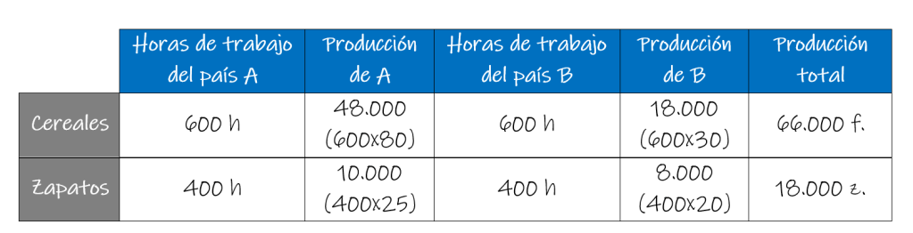 Sin embargo, si el país A se concentrara en la producción de cereales y el país B en la producción de zapatos, ocurriría lo siguiente: