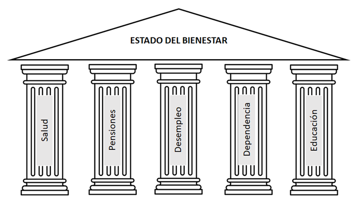 Los pilares sobre los que se asienta son los seguros públicos que cubren estos riesgos: seguro sanitario, seguro de desempleo y el sistema de pensiones. Posteriormente se ha añadido un cuarto que cubre las situaciones de dependencia en las que nos podemos encontrar. La educación, por su papel fundamental de igualadora de oportunidades, se suele incluir también, aunque estrictamente no cubre ningún riesgo.