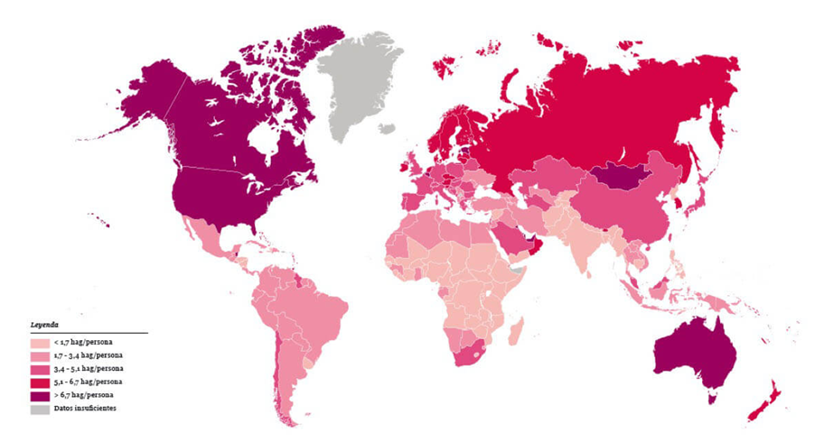 Según el último informe de la Global Footprint Network, con datos de 2012, la demanda actual a escala global de nuestras actividades es de 2,7 hectáreas (ha) por persona, mientras que lo que el planeta puede suministrar se sitúa en torno a las 2 ha per cápita. Además, estos valores varían según las regiones del planeta: mientras EEUU tiene una huella ecológica de 8,2 ha per cápita y España de 3,7, Angola sólo tiene una huella ecológica de 0,9 ha por persona. Esto significa que los habitantes de los países desarrollados estamos viviendo por encima de las posibilidades de regeneración ecológica y disminuyendo cada año la capacidad planetaria de sostenernos.