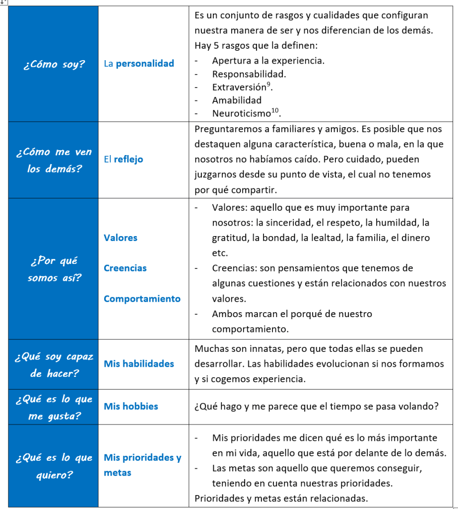 Para desarrollar nuestro máximo potencial personal debemos llegar a esa tercera persona. El autoconocimiento es un proceso reflexivo por el que una persona adquiere noción de sí misma, de su personalidad, sus cualidades y defectos, sus creencias y valores, necesidades, aficiones y temores.