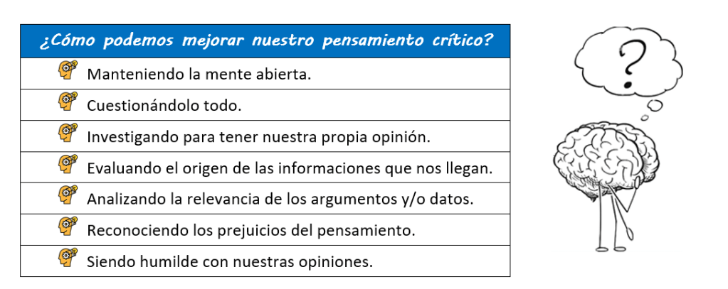 El pensamiento crítico es la capacidad para analizar con objetividad los hechos o los razonamientos, sin ser influido por las opiniones de otros. Se trata de sacar nuestras propias conclusiones, no las que nos impongan los demás. ¡OJO! No debemos confundir el pensamiento crítico con criticar a otras personas.