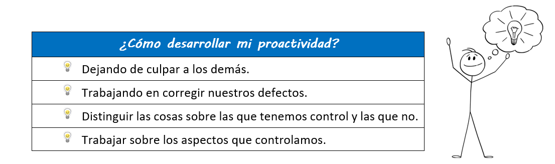 Todas estas habilidades que acabamos de ver las podemos resumir en una: ser proactivo. La proactividad implica tomar la iniciativa de nuestras vidas. Supone comprender que nuestra vida no depende de una serie de circunstancias, sino de las decisiones que tomamos.