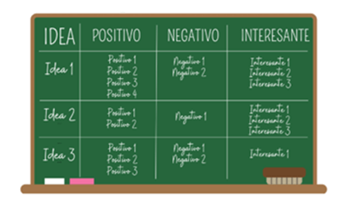 Finalmente debemos dar algún sistema de puntuación. Por ejemplo, podemos decir que los aspectos positivos suman 1, los interesantes suman 0´5 y los negativos restan 0´5. Ganaría la idea con mayor puntuación.