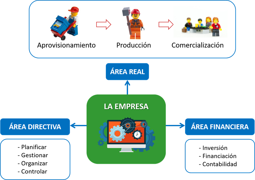 Para terminar este primer apartado de nociones básicas sobre la empresa solo nos queda hablar de su estructura. La empresa se organiza en tres grandes áreas o departamentos. El área real, que engloba a las actividades de aprovisionamiento, producción y comercialización de los productos, el área financiera, que se encarga de buscar los recursos financieros y decidir el mejor uso para los mismos, así como de llevar la contabilidad y, en base a ella, analizar la situación económica y financiera en la que se encuentra la empresa (básico para poder tomar decisiones) y, por último, el área de dirección con tolo lo que ello conlleva, planificar, organizar, gestionar y controlar la empresa.