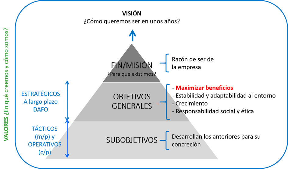 Como vemos, podemos diferenciar entre el fin de la empresa u objetivo general, los objetivos propiamente dichos y los subobjetivos.