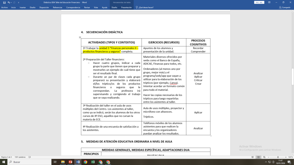 | 3. Finanzas personales II: productos financieros y seguros | Taller de Educación financiera | Preparar material y llevar a cabo un taller de educación financiera en el Centro para aquellos alumnos que no tengan materias de Economía. |