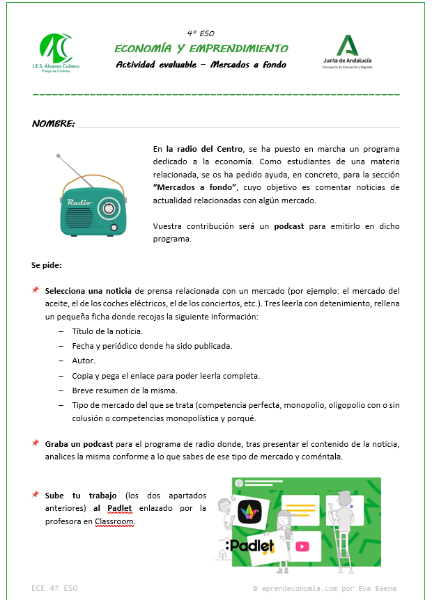| 4. Los mercados | Podcast “Mercados a fondo” | Tras seleccionar las noticias económicas de actualidad relacionadas con algún mercado, analizarlas y resumirlas, se grabarán podcast para emitirlos en la radio del Centro. |