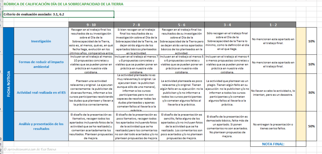 | 6. Economía social | Día de la sobrecapacidad de la Tierra | Tras familiarizarse con ese día y estudiar la huella ecológica de España y países de nuestro entorno y también la personal de cada uno, proponer un pequeño reto a la clase (o a nivel de Centro) para reducirla. Ejemplo: “recreos residuos cero”. |