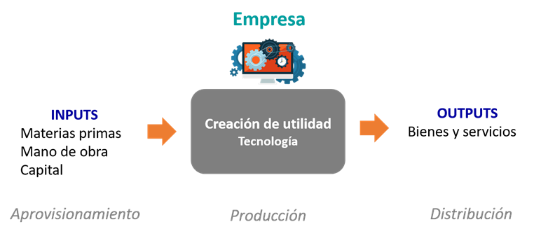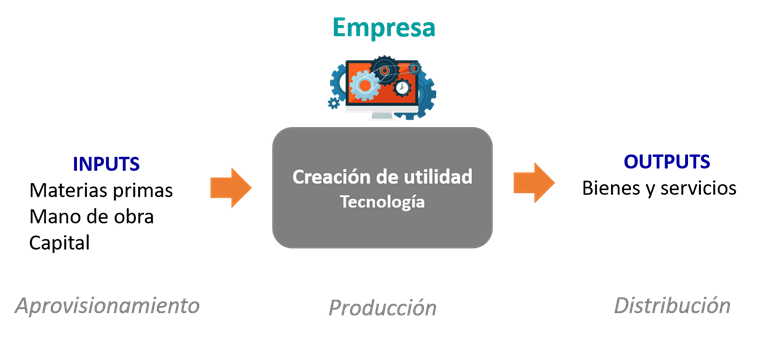 Como vimos en Economía de 1º, las familias satisfacen sus necesidades mediante el consumo de bienes y servicios pero, para que esto pueda suceder, primero estos bienes y servicios han de ser producidos. Las empresas son el agente económico encargado de producir bienes y servicios, transforman los factores productivos (inputs) en productos (output), generando valor o utilidad en el proceso.