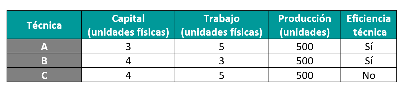 Ilustraremos ambos conceptos mediante el siguiente ejemplo: supongamos que una confección para fabricar 500 pantalones, puede optar por emplear tres técnicas (A, B y C), empleando como factores productivos el trabajo y el capital. La tabla siguiente nos muestra las distintas combinaciones de recursos productivos de cada una de las técnicas que la empresa se dispone a valorar para llevar a cabo su proceso productivo: