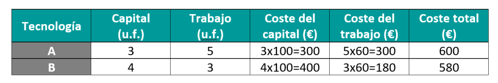 Siguiendo con el ejemplo, si suponemos que el precio del capital es de 100 € al día por máquina y que el precio del factor trabajo es de 60 € al día por trabajador, el coste de cada una de las tecnologías aparece expresado en la tabla siguiente: