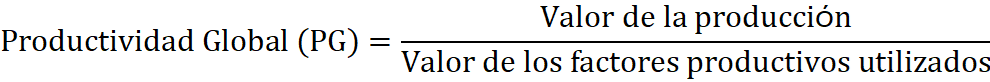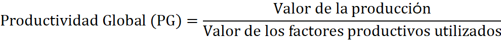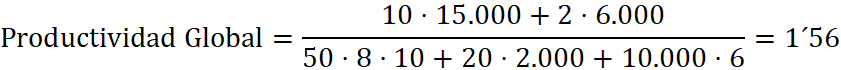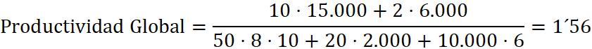 También podemos calcular la productividad global de la empresa, pero hacerlo implica un problema, que tenemos que agregar productos y factores de producción de diversa naturaleza. Como no podemos hacerlo, y tenemos que expresarlo todo en una magnitud homogénea, lo que se hace es expresar tanto los productos como los factores de producción no en unidades físicas sino su valor en unidades monetarias (para nosotros, en euros).