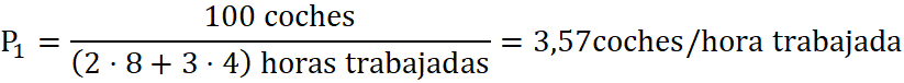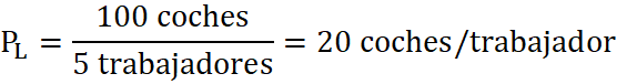 - Una fábrica produce 100 coches diarios con 5 personas en plantilla.