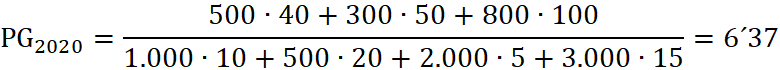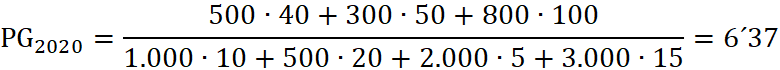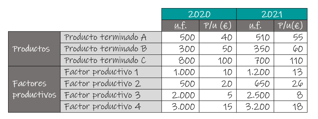 Ejemplo 3 (PEVAU Andalucía 2022). La empresa “Segundo de Bachillerato S. A.” presenta la información relativa a los productos fabricados y los factores productivos utilizados correspondientes al año 2020 y 2021 en la siguiente tabla: