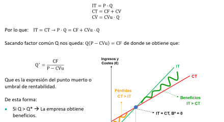 LOS INGRESOS IT = P x Q IMe = IT / Q B. LOS COSTES DE PRODUCCIÓN Los costes de producción de una empresa se pueden definir como el valor monetario de las cantidades consumidas de factores productivos. Diferenciamos varios tipos: CT = CF + CVu x Q CMe = CT / Q Representación gráfica: … Seguir leyendo